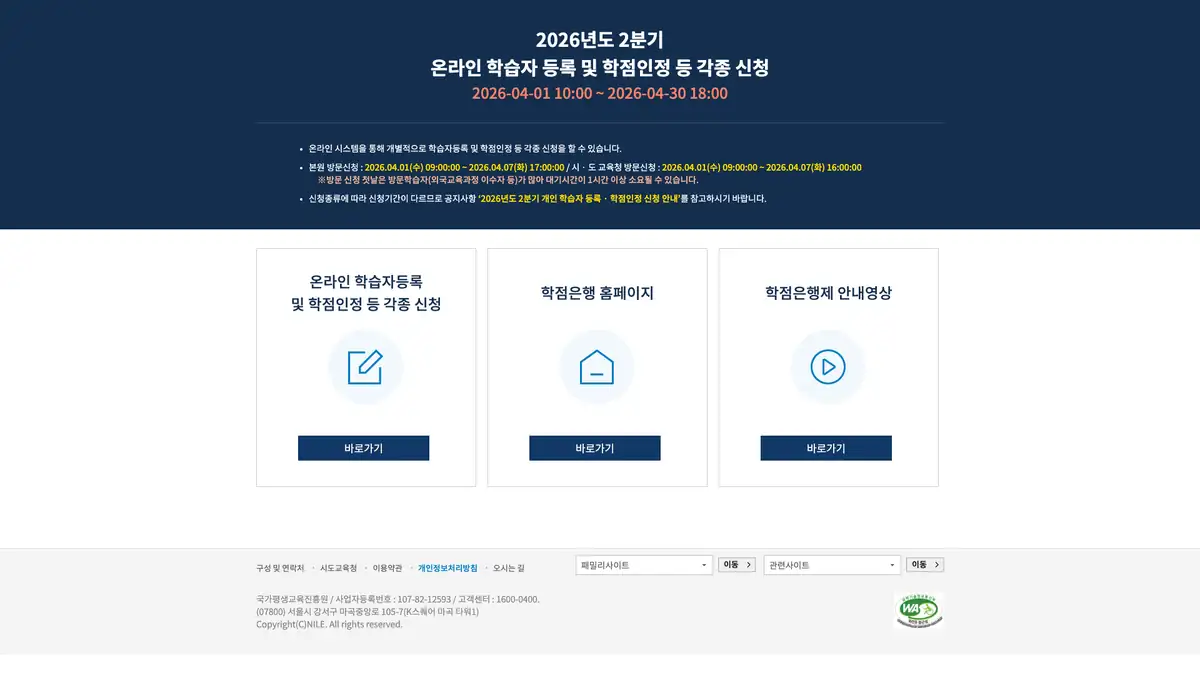 국가평생교육진흥원 학점은행제 공식 포털을 통해 학습자 등록 및 학위 취득에 필요한 제반 행정 절차 확인이 가능합니다.