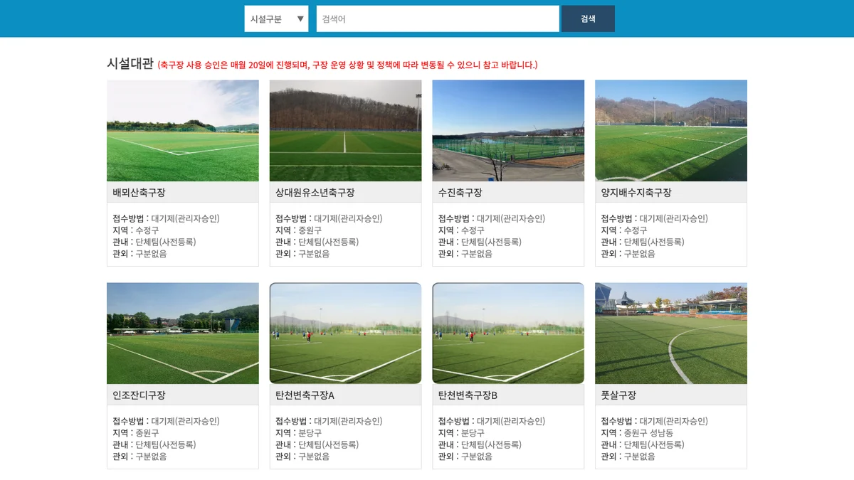 | 체육시설 예약 | 축구장, 테니스장, 배드민턴장, 수영장 신청 | 시설별로 선착순 또는 추첨제로 상시 운영 |