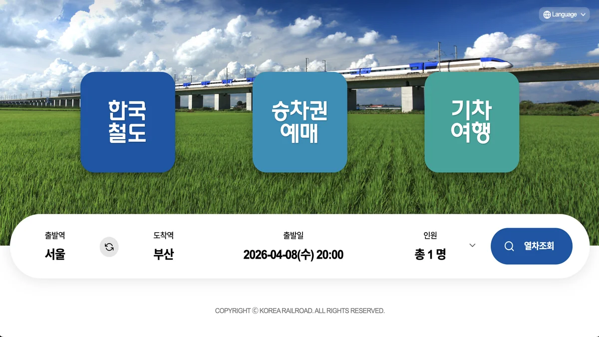 - 출발역과 도착역, 승차 인원 및 날짜를 설정한 후 열차 조회 버튼을 눌러 이용 가능한 목록을 확인합니다.